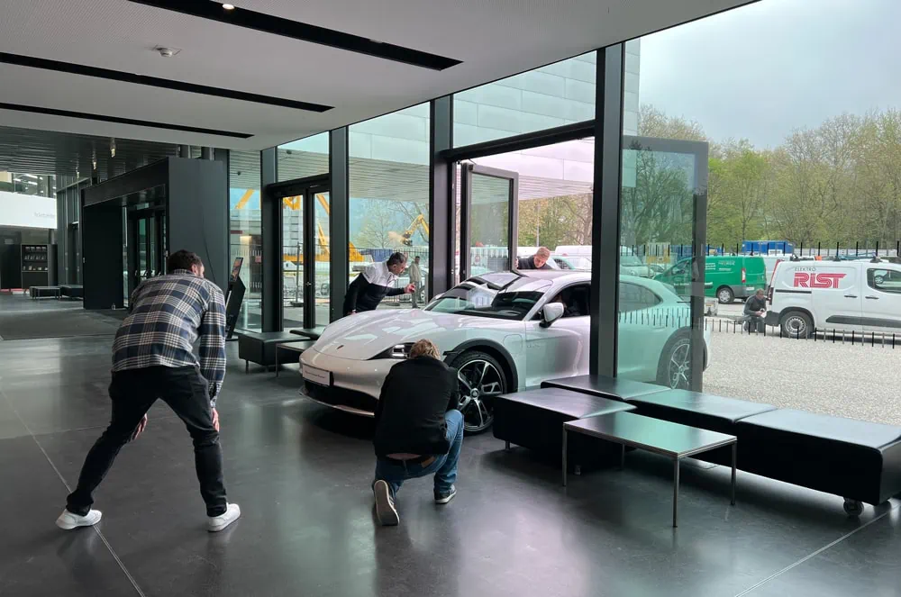 Nachdem wir das Auto ausgeräumt hatten, ging es los mit dekorieren. Das hatten wir aber schnell erledigt und schon waren wir fast startklar für den Hochschulwettbewerb. Eins fehlte noch: der Porsche. Hierbei haben wir alle kurz geschwitzt! Denn die Tür, durch die der Porsche durchgefahren werden musste, war ganz schön eng. Rechts und links waren nur wenige Zentimeter Platz. Aber das Zittern hatte sich gelohnt. Der Porsche Taycan war eine richtige Attraktion. Nun waren alle Vorbereitungen gemacht.