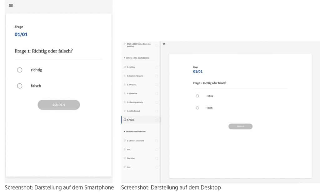 Eine weitere Besonderheit des Tools sind die sogenannten „Pre-Built Lessons“. Das sind vorgegebene Standard-Module, die in E-Learning-Lektionen häufig vorkommen und nur noch mit Content gefüllt werden müssen. Die interaktiven Funktionalitäten sind in den Pre-Built Lessons bereits enthalten.