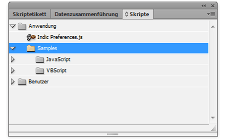 Wie Sie sehen, ist das Fenster „Skripte“ bereits unterteilt. Unter dem Ordner „Benutzer“ finden Sie Ihre eigenen, unter „Anwendung“ die vorinstallierten Skripte. Samples ist das englische Wort für Beispiele oder Proben. Weiter unterscheidet InDesign zwischen den vorinstallierten Java-Skripten und den VisualBasic-Skripten (VB-Skripten). Mac-User werden anstelle von „VBScript“ einen Ordner „AppleScript“ vorfinden.