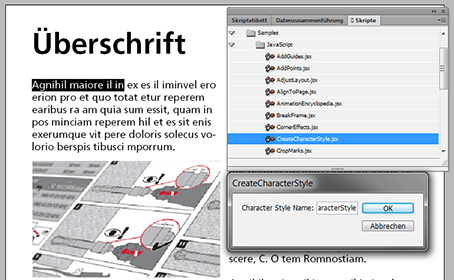 Nehmen wir an, Sie haben in einem Dokument einige Zeichen formatiert, mitsamt Laufweite, Farbe usw., die sie nun als Zeichensatz anlegen wollen. Sie markieren einen kleinen Teil des Textes und mit einem Doppelklick auf „CreateCharacterStyle.jsx“ erstellt Ihnen InDesign dank des Skriptes einen umfassenden Zeichensatz und fragt Sie zum Schluss, welchen Namen dieser Zeichensatz haben soll.