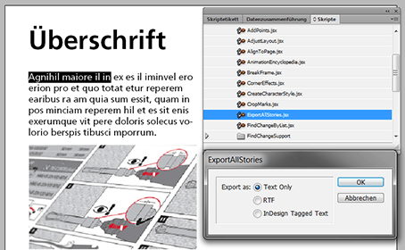 Sie haben ein fertiges InDesign-Dokument zugesendet bekommen und wollen sich, zum Beispiel zum Korrekturlesen, nur dem Text widmen? Mit dem Skript „ExportAllStories.jsx“ exportiert Ihnen InDesign nur den Text. Sie haben die Möglichkeit, zwischen Text Only, RTF und InDesign Tagged Text zu wählen. Außerdem können Sie angeben, wo die Daten gespeichert werden sollen. Anzumerken ist, dass InDesign für jedes Textfeld eine separate Datei erzeugt. In meinem Beispiel (s. u.) erzeugt InDesign also eine Textdatei für die Überschrift und eine weitere Datei für das etwas größere Fließtextfeld.