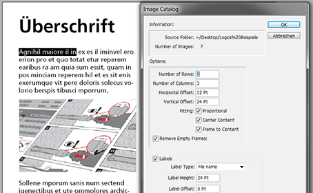 Sie wollen Grafiken in einem InDesign-Dokument rasterartig ablegen, um einfach noch einmal drüberzuschauen? Mit diesem Skript erstellt Ihnen InDesign ein neues Dokument und ordnet in diesem Dokument die Grafiken automatisch an. Dazu müssen Sie den Ursprungsordner angeben und in der darauffolgenden Maske noch weitere Punkte definieren. Hier legen Sie fest, in wie viele Reihen und Spalten das Raster unterteilt werden soll, wie groß der Abstand zwischen den Reihen und Spalten ist und ob und wie die Grafiken skaliert werden. Weiter können Sie angeben, ob und wie die Grafiken automatisch beschriftet werden und diese Bildunterschriften in einen vorher erstellten Absatzformat formatieren lassen. Hierfür lässt sich eine separate Ebene (Layer) angeben.