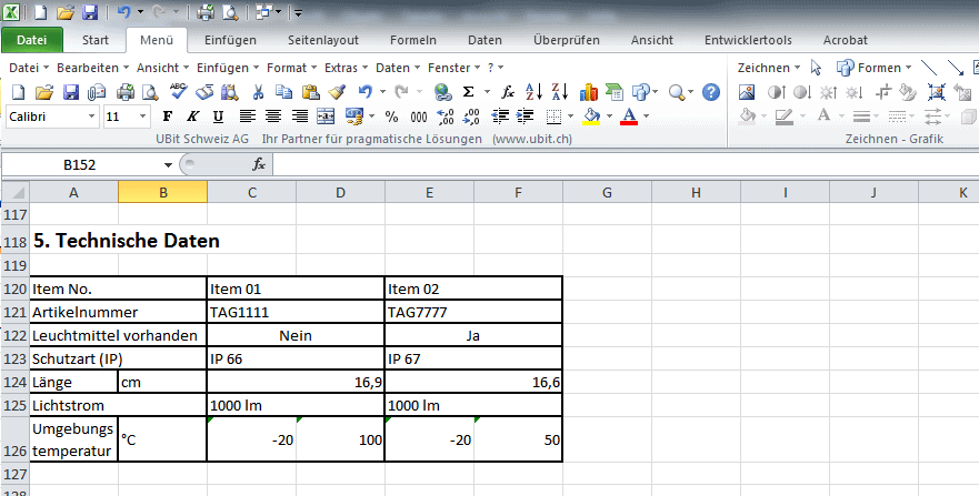 - »Extrahiere den Wert in der Zelle rechts von Leuchtmittel vorhanden nur, wenn die Checkbox links des Wertes gecheckt ist.« (Um nur gültige Inhalte zu extrahieren.)