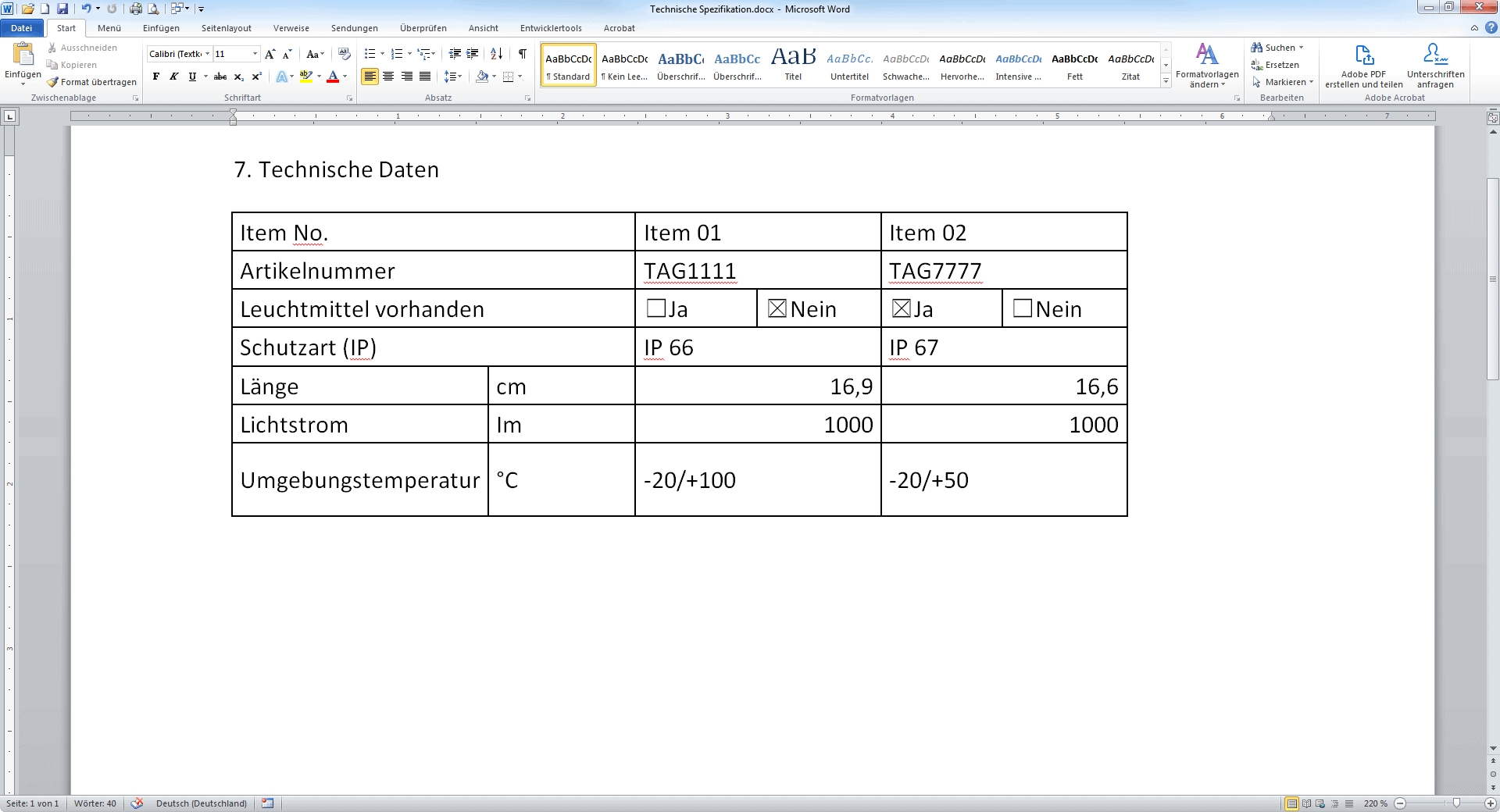 Die Beispielbilder zeigen, wie unterschiedlich die technischen Daten zweier ähnlicher Produkte ursprünglich aussahen. Beim einen handelte es sich um ein Excel-, beim anderen um ein Word-Dokument. Darüber hinaus sind Werte mit und ohne Einheit und die Temperaturangaben in gänzlich verschiedener Art eingetragen worden. Wie gesagt: Für die kognitiven Fähigkeiten eines Menschen keine Herausforderung, für ein Computerhirn aber schwer verständlich. Soll nun das Produktmerkmal »Leuchtmittel vorhanden« extrahiert werden, dann könnte man die technischen Regeln für diese Aufgabe wie folgt in Worte fassen: