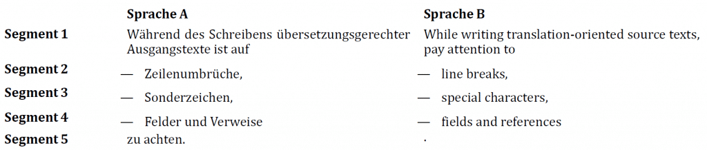 Hier ist einmal die Anzahl der Segmente unterschiedlich. Weiterhin ist die Übersetzung des ersten Segments nicht exakt, da im Englischen das Verb integriert wurde. Eine Lösung wäre gewesen, schon im Deutschen das Verb in den einführenden Text zu holen: „Während des Schreibens übersetzungsgerechter Ausgangstexte achten auf:“ oder mit direkter Anrede zu formulieren: „Achten Sie beim Schreiben übersetzungsgerechter Ausgangstexte auf:“.