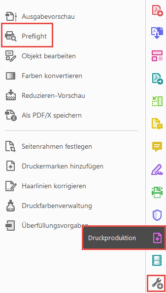Preflight findet sich trotz seines Funktionsumfangs noch immer in den Werkzeugen für die Druckproduktion. Ist diese Werkzeugkategorie am rechten Rand des Programms noch nicht hinterlegt, ist es über den untersten Menüpunkt „Mehr Werkzeuge“ zu finden.