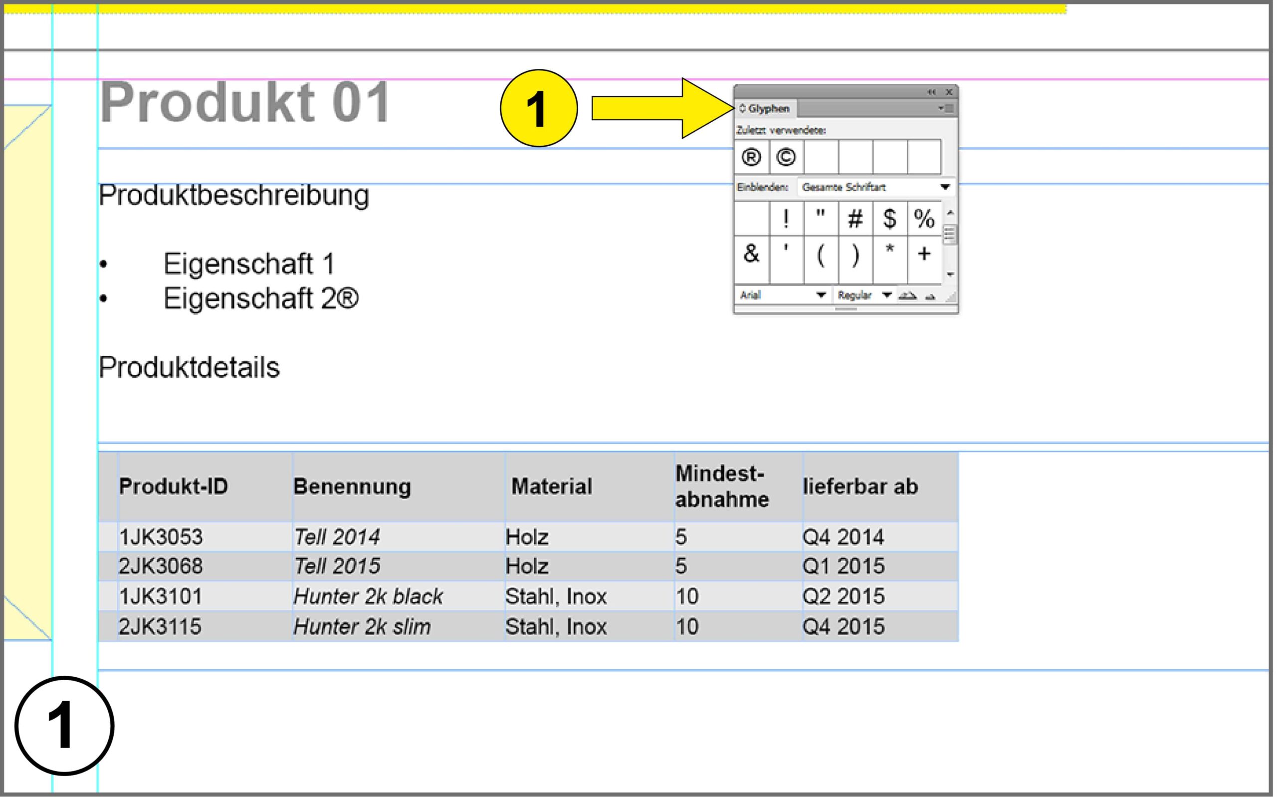 Das Symbol ® finden Sie in InDesign im Fenster „Glyphen“ (1). Das dargestellte Fenster versteckt sich bei Ihnen vielleicht noch unter „Schrift und Tabellen“. Fügen Sie das Symbol mit einem Doppelklick in Ihr Dokument ein. Das Hochstellen von ® lässt sich mit einem GREP-Stil in ein Absatzformat einfügen, so dass Sie sich um diese Kleinigkeit nicht mehr kümmern brauchen.