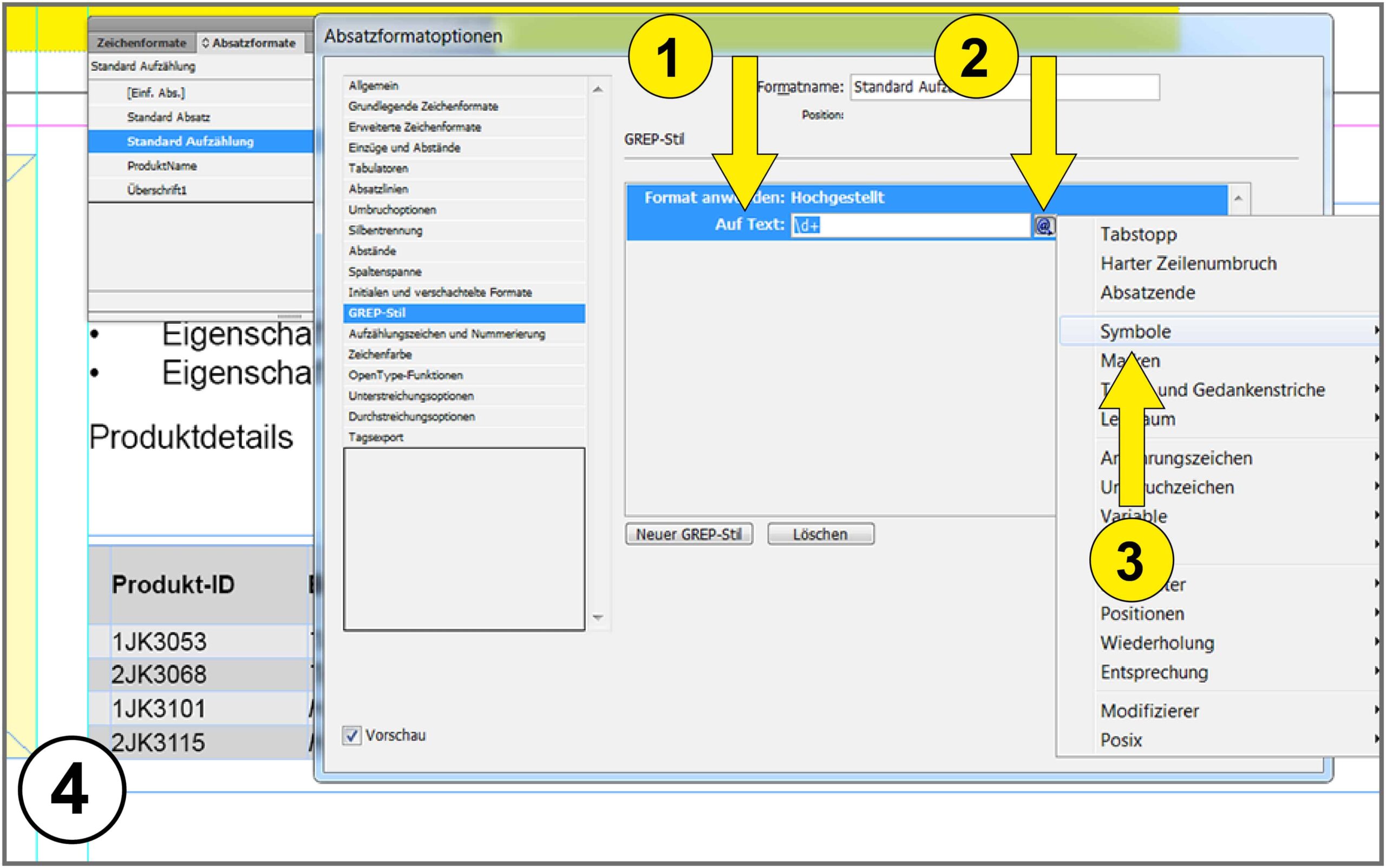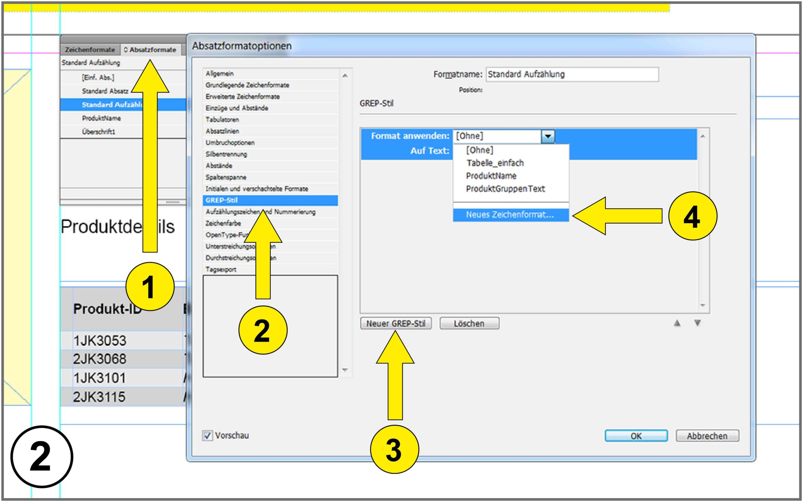 Öffnen Sie das Fenster „Absatzformate“ (1). In meinem Beispiel habe ich bereits meine „Standard Aufzählung“ auf meinen Text angewendet. Nun bearbeiten Sie das verwendete Absatzformat (Doppelklick) und suchen dort die Rubrik „GREP-Stil“ (2). Hier erstellen Sie einen neuen GREP-Stil (3).