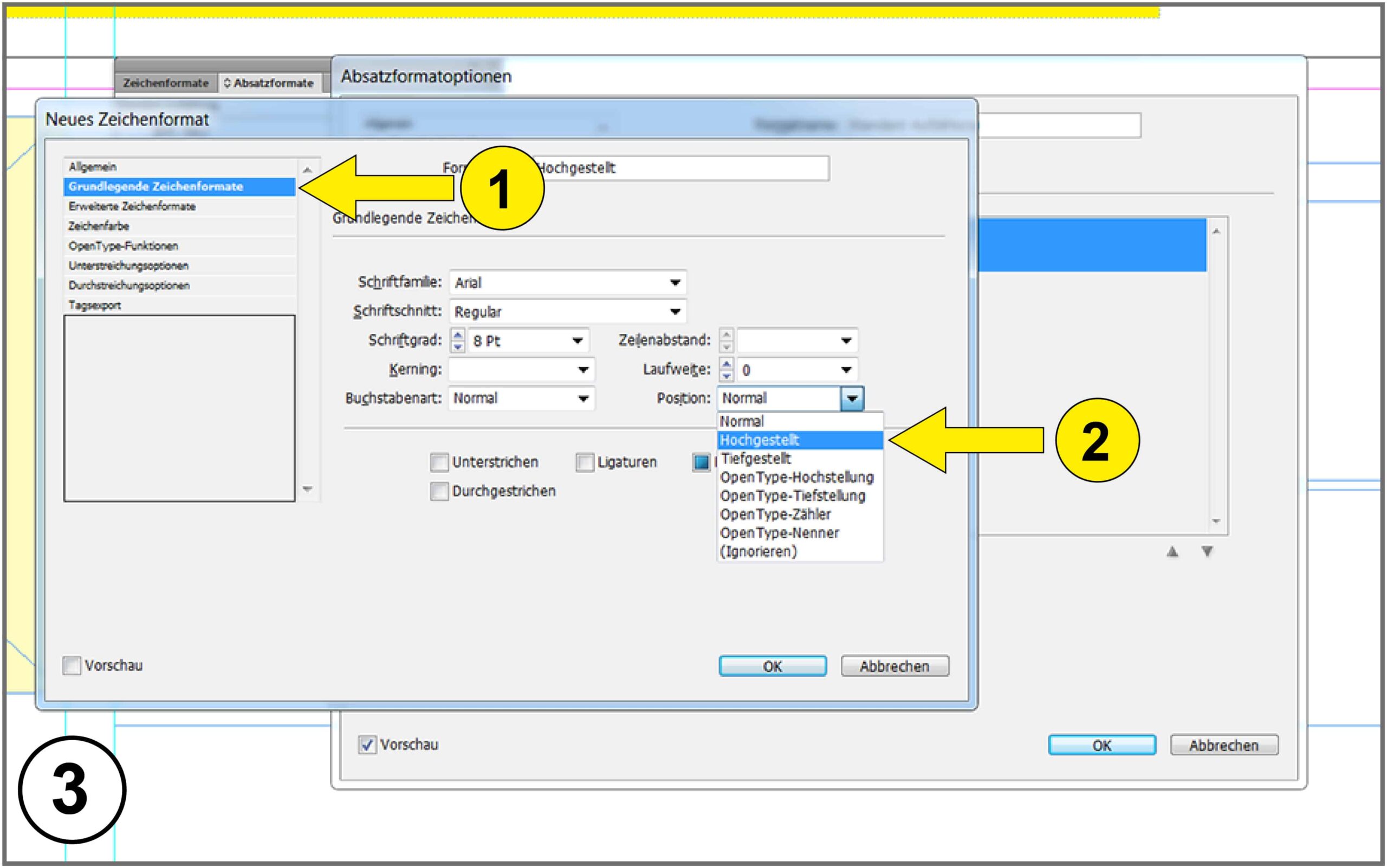 Geben Sie dem neuen Zeichenformat einen Namen und gehen Sie dann auf „Grundlegende Zeichenformate“ (1). Hier wählen Sie beim Feld „Position“ „Hochgestellt“ (2) aus und bestätigen das Ganze mit „OK“. Dieses Zeichenformat sorgt nachher dafür, dass das ® hochgestellt wird.