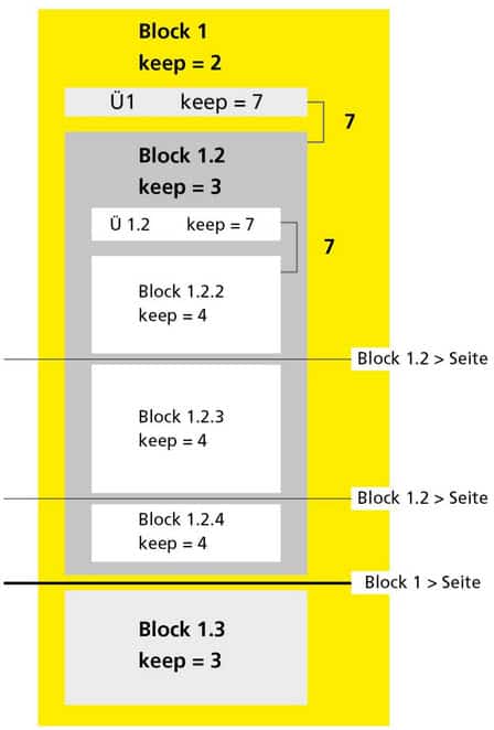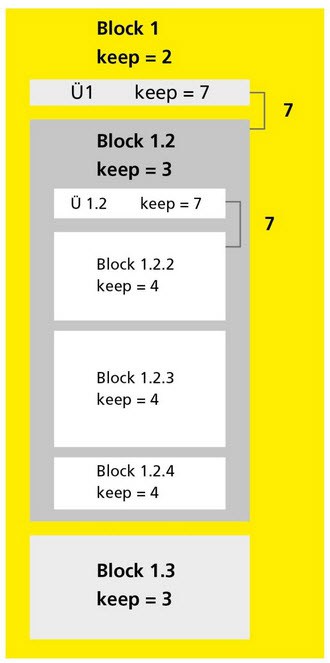 Wir haben Block 1 mit keep = 2. Er besteht aus der Überschrift Ü1 mit keep = 7 und aus den Blöcken 1.2 und 1.3, die jeweils keep = 3 haben. Bei Block 1.2 zeigen wir die innere Struktur mit einer Überschrift Ü1.2 (keep = 7) und drei Blöcken mit keep = 4. Die Überschriften Ü1 und Ü1.2 sind mit keep-with-next = 7 an den folgenden Block gebunden.